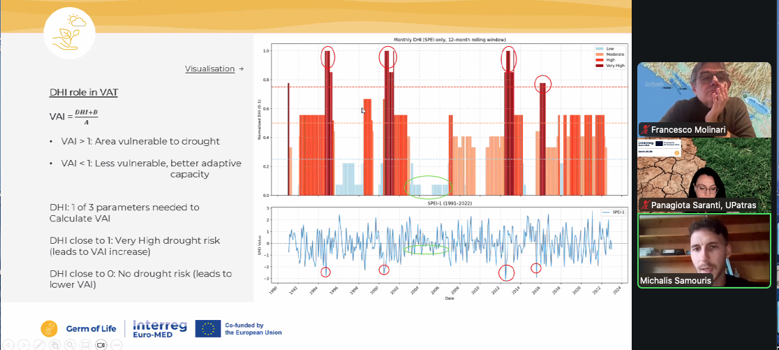 The webinar also includes a dedicated session on risk assessment, featuring Michalis Samouris (University of Patras), who explains how indicators are calculated to measure drought vulnerability, and Miltiadis Anastasiadis (Dotsoft, Greece), whose recent passing we deeply regret and whose technical contribution and personal commitment have been highly significant for the development of Germ of Life.